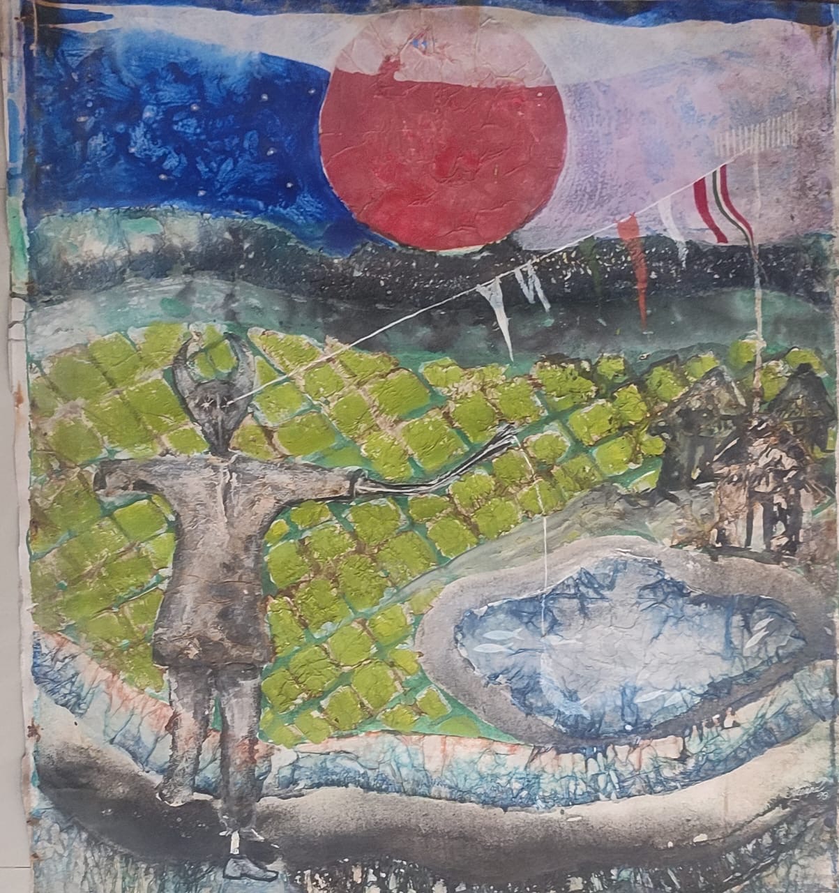 The early Archaic Memory paintings exude an air of antiquity. The Bijagni-Jivagni series is a flawless retelling of abstract dreams. Panicker’s ability to conjure up myths in a Tantric manner and give them visual permanence is remarkable. He has created many paintings in the holographic technique. Panicker has used tempera, acrylic and ink more than oil paints. Geometric shapes, cells, color accumulations, general transparency and a ‘space within the space’ nature are the characteristics of Jayapalapanikar’s paintings.
